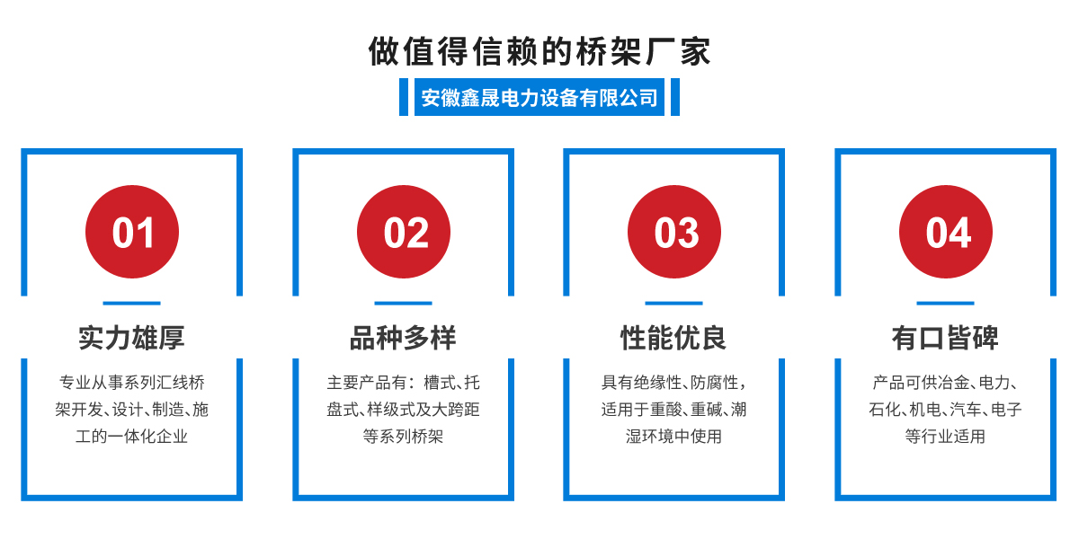 安徽鑫晟電力設備有限公司是專注從事系列匯線橋架開發(fā)、設計、制造、施工的一體化企業(yè),主要產品有:槽式、托盤式、梯級式及大跨距等系列橋架。產品選用冷軋或熱軋鋼板井對...